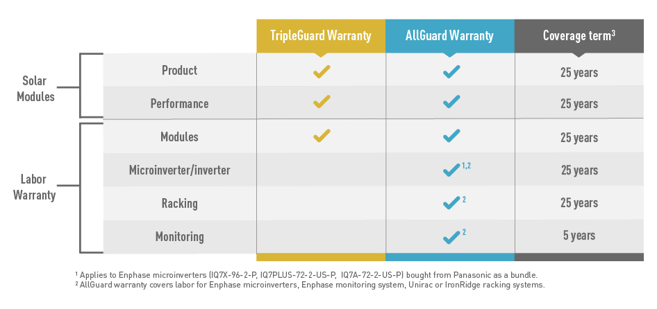 A long-term warranty is only as dependable as the company standing behind it. That’s why a trusted relationship with your solar panel manufacturer should be given careful consideration. Backed by one of America’s most trusted brands and over a century of stability, Panasonic AllGuard and TripleGuard warranties cover your solar panel system for performance, product, parts, and labor for 25 years³.
